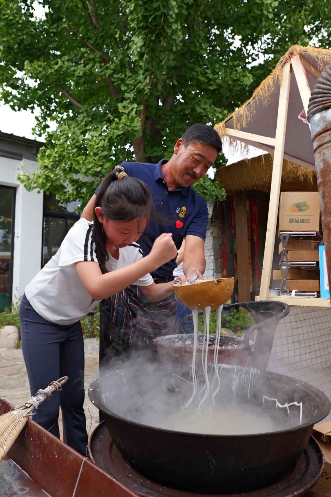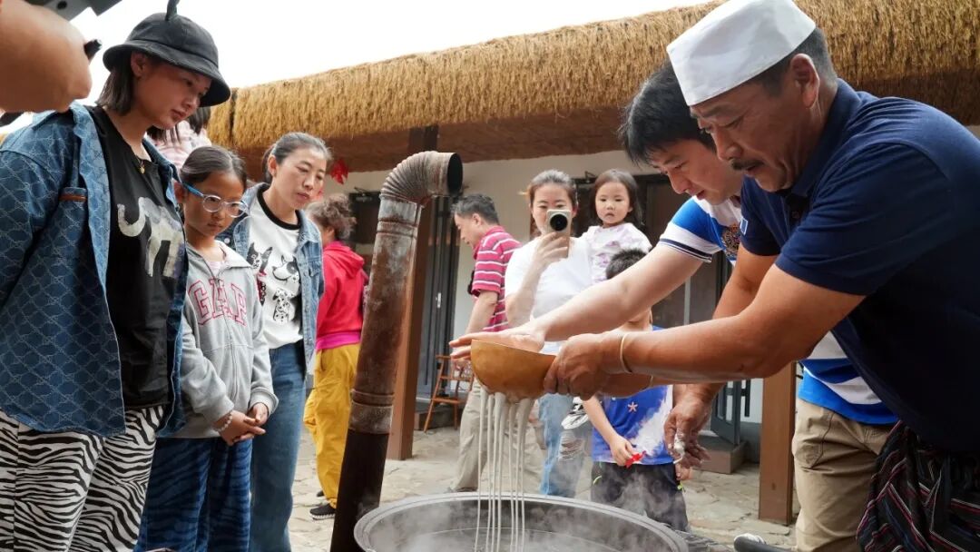 另一侧的传统漏粉区,不少游客围在灶火旁跃跃欲试。传承人刘洪波熟练的将红薯粉和水按比例调和,揣揉成光滑的面团,随后将漏瓢交到游客肖女士手中,边扶着她的手腕边指导,“手要稳,移动速度别太快,让粉均匀漏下。”初次操作的肖女士虽略显生疏,但看着自己漏出的粉条在沸水中翻滚,脸上满是兴奋,“原来一碗粉条要这么多讲究,亲手做的吃着肯定更香!”刘洪波介绍,此次活动还特意准备了便携包装,让大家能把新鲜漏好的粉条带回家,分享非遗美味。