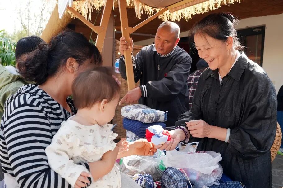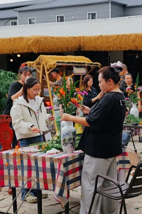 午后的户外餐区被秋日花香浸润,传统插花体验吸引了众多游客。“花器是微缩的天地,今天咱们主打瓶花创作。”传承人席玉兰一边讲解一边拿起花剪演示,不时逐个指导插作技巧。活动结束时,游客们纷纷捧着自己的作品合影,瓶中摇曳的花枝成为最动人的节日装饰。在玲珑枕体验区,传承人朱会萍正耐心指导走线技巧,游客亲手体验缝制沙包并填充荞麦壳与山楂籽,在一针一线间感受非遗的魅力。