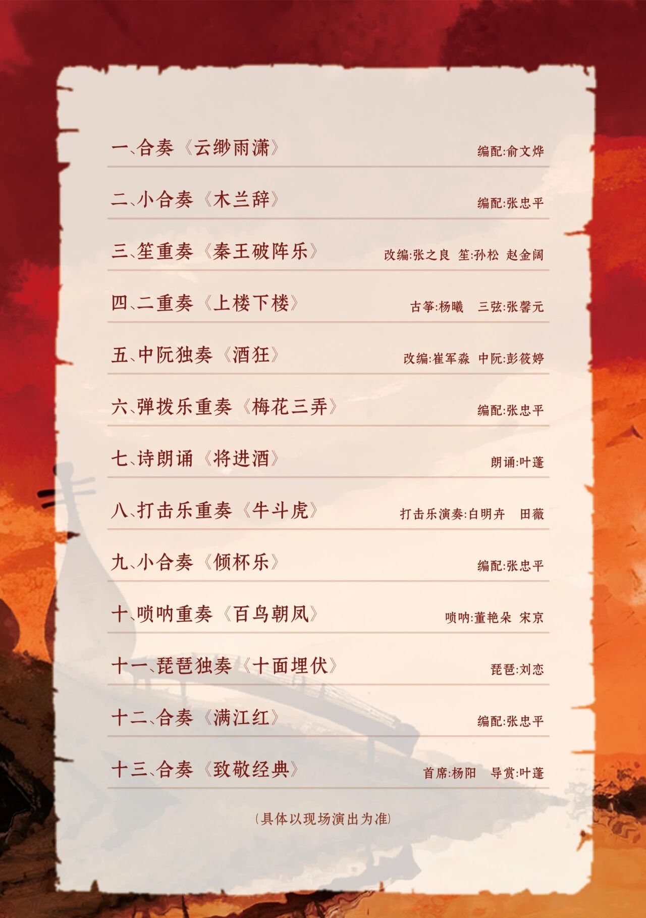 本场《满江红》民族音乐会作为“中国人的音乐”系列收官演出,旨在通过合奏、独奏、重奏及诗朗诵等多元形式,演绎《木兰辞》《十面埋伏》《将进酒》等经典名曲,展现民族音乐的深厚底蕴与艺术魅力,由首席演奏家领衔的专业阵容将为读者观众呈现一场极具艺术感染力的音乐现场,为“中国人的音乐”系列活动画上圆满句号。