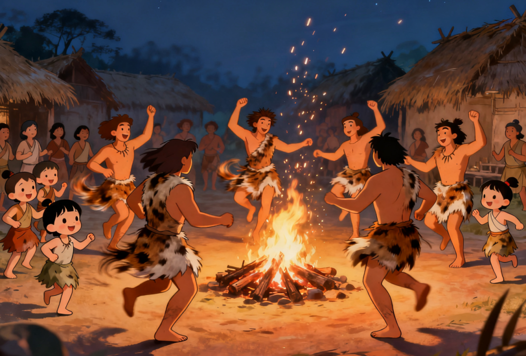 想象一下,在远古时代,我们的祖先刚刚打完猎,围着篝火,用统一的动作和呼喊来庆祝。