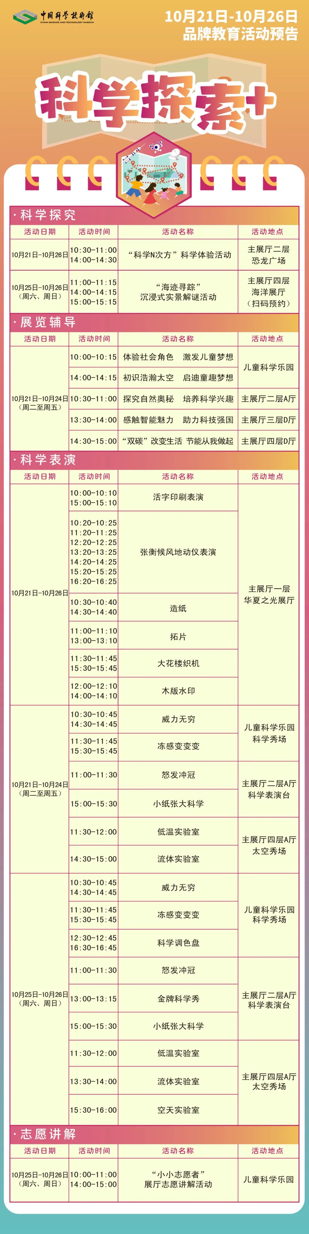 10月21日-10月26日品牌教育活动预告 2025.10.21 - 2025.10.26 #场馆 中国科学技术馆 中国科学技术馆 场次 数量最多可购1张 - 1 + 活动已结束 +1 新浪微博 QQ空间 QQ好友 微信 取消 服务说明 1、每笔订单最多可选座1个座位号; 2、选座时,请尽量选择相邻座位,不要留下单个座位; 3、点击”完成选座”后,请在120S内及时提交,超时系统将释放你选定的座位; 4、选座订票为特殊商品,出票成功后,如无无法使用问题,不得退换; 5、出票成功后,请牢记取票密码,若没有收到取票短信,请到订单中心查询,或拨打客服电话400-0596-087; 活动详情 预约须知 评论区(0) 添加表情 发布评论 小编推荐 9 10月14日-10月19日品牌教育活动预告 2025-11-07 中国科学技术馆 12 【活动预告】方圆之间见文明——良渚玉器里的科学文化密码主题活动 2025-11-07 中国科技馆主展厅一层“华夏科技学堂”(位于“华夏之光”展厅入口处)