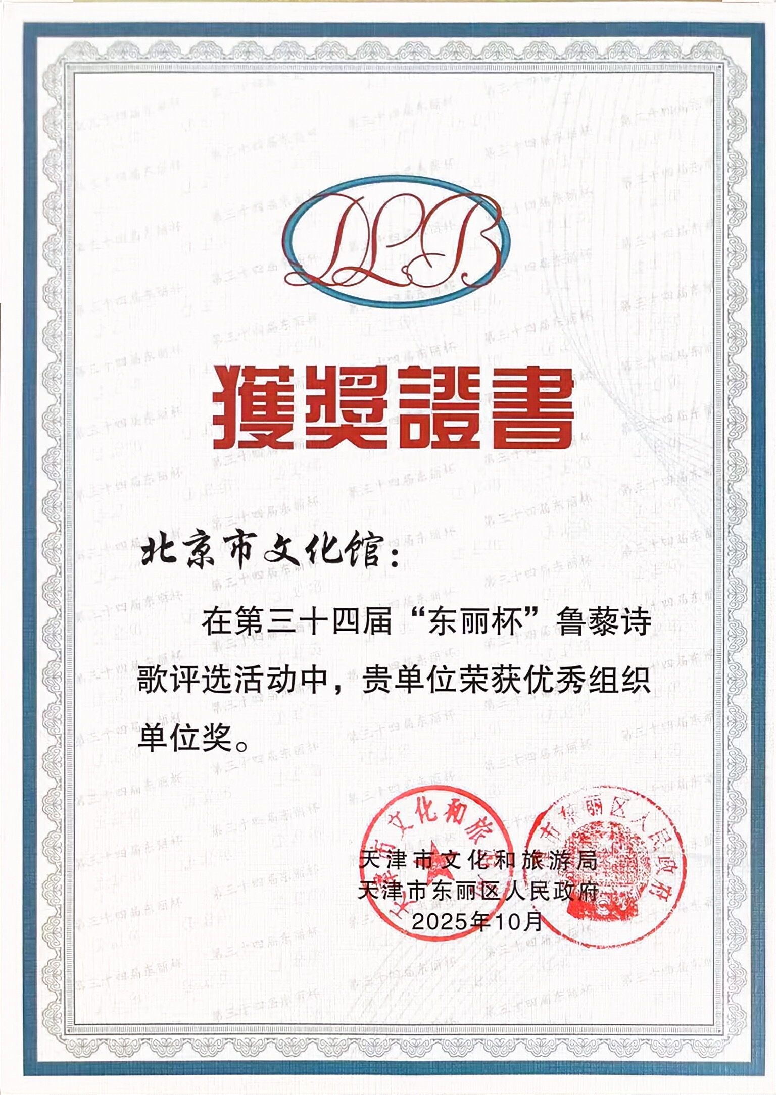 日前,由天津市文化和旅游局、天津市东丽区人民政府主办,天津市群众艺术馆、天津市东丽区文化旅游体育局承办的第三十四届“东丽杯”鲁藜诗歌评选活动获奖名单揭晓。北京市文化馆及报送作品共获得4个奖项。
