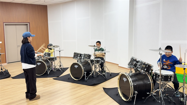 架子鼓活力节奏班:北京市文化馆业务骨干赵婧璇老师以节奏启蒙为核心,通过拍手打节拍、分段模仿鼓点等互动形式帮助小学员快速掌握演奏技巧,让孩子们在活泼跳跃的鼓点中释放活力,尽显浓厚的学习热情和童真活力。