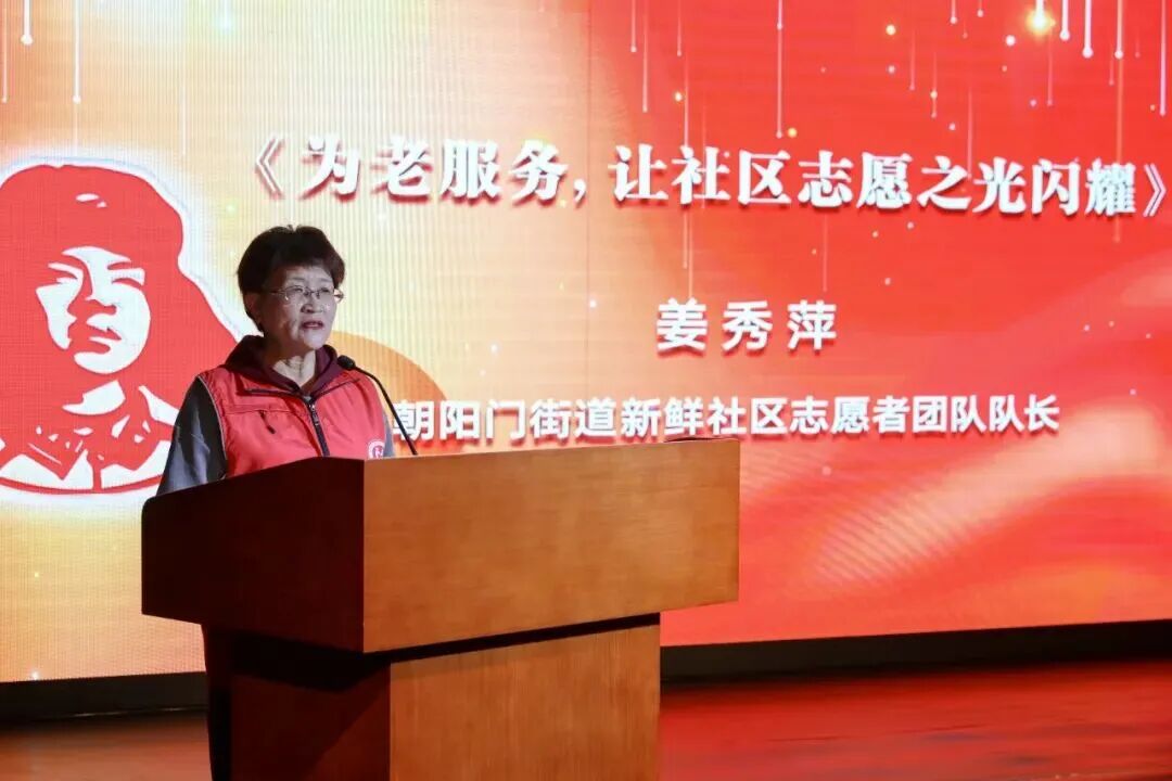 “退休不褪色,余热映初心。让我们继续以爱之名,用心、用情、用力做好社区为老服务,把这份志愿精神传递下去,把这束志愿之光延续下去,让每一位社区老人都能老有所养、老有所依、老有所乐、老有所安,让每一位老人都能安心地说:‘有社区在,有志愿者在,我们的晚年不怕孤单,满是温暖。’”——朝阳门街道新鲜社区志愿者团队队长姜秀萍《为老服务,让社区志愿之光闪耀》