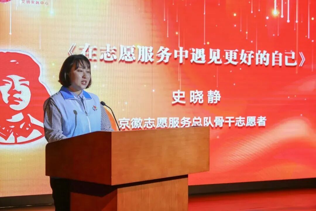 “今天站在这里宣讲,我内心充满了感动与荣幸。我是京徽志愿服务总队的一名普通的志愿者,也是一名退役军人,部队的经历锤炼了我的意志,更让我养成了认真负责、踏实肯干的良好作风,让我始终把责任与担当放在心上。对我而言,志愿服务不只是付出,更是一份坚守、一份信仰、是融入血脉的责任。”——京徽志愿服务总队骨干志愿者史晓静《在志愿服务中遇见更好的自己》
