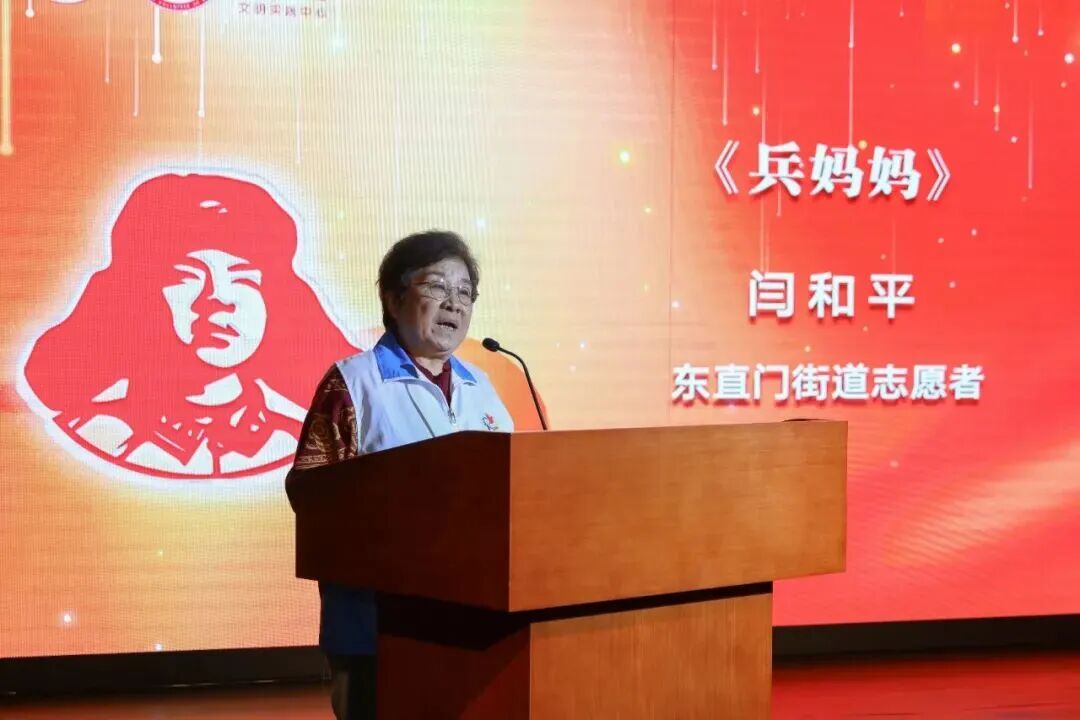 “大家都知道部队每天就是训练、政治教育、站岗、执勤,业余生活很少,于是我就发挥我的特长,培养战士们的文艺爱好。一天,战士们走来对我说:‘阿姨,您对我们真好,就像我们的亲妈妈,您就一个女儿,让我们做您的儿子吧!’望着他们那一双双期盼的眼神,我感动了,同意了,从那时起,我就成了战士们的‘兵妈妈’。学习雷锋精神,传承红色基因,是我们每一位拥军兵妈妈不变的初心。让我们携手同行,让雷锋精神在新时代绽放新光芒,让拥军优属的优良传统代代相传、永不停歇!”——东直门街道志愿者闫和平《兵妈妈》