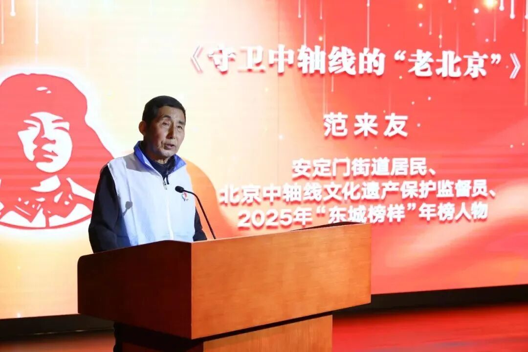 “这些都是我作为一名中轴线文化遗产保护监督员的一种沉甸甸的责任。有人问我年龄大了,图啥?我图的是让更多的人像爱护传家宝一样,守护好我们的中轴线和我们的中国文化。作为一个老东城人,虽然我已退休,但只要身体允许,我就会继续在咱们钟鼓楼脚下做个守夜人。”——安定门街道居民、北京中轴线文化遗产保护监督员、2025年“东城榜样”年榜人物范来友《守卫中轴线的“老北京”》