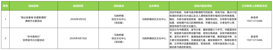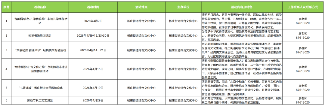 春风拂面,文脉飘香。通州区文化馆深化总分馆联动机制,携手各街道(乡镇)分馆重磅推出4月文化惠民活动,百余场特色活动缤纷上线,将非遗体验、民俗传承、公益培训、阅读分享、文体互动等多元文化服务送至群众身边,快约上您的家人、朋友一起来解锁打卡,赴一场春日文化之约吧!