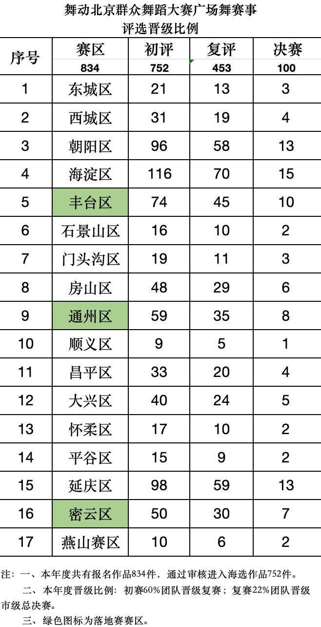 2024年“舞动北京”以首都市民为中心,面向基层舞队,将有序开展广场舞蹈赛事活动若干场,本年共计834支团队报名参加此次广场舞赛事活动,通过海选的队伍有752支,入围17场区赛复赛的队伍是按照60%晋级标准,约有453支,最终入围百团总决赛的队伍约100支。具体如下: