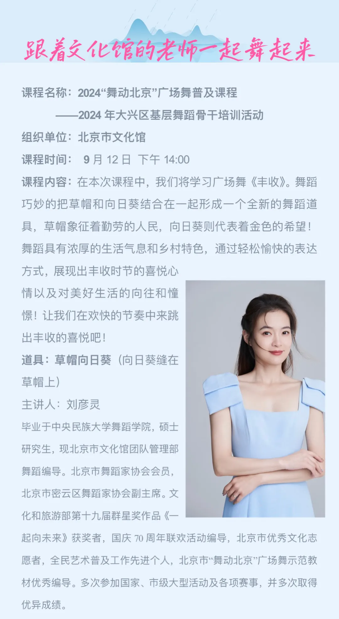接下来,北京市文化馆将继续携手各区兄弟单位,持续开展“跟着文化馆的老师一起舞起来”2024“舞动北京”广场舞普及课程。下一站,我们将一起走进大兴区,跟着彦灵老师一起,感受金秋《丰收》的喜悦!
