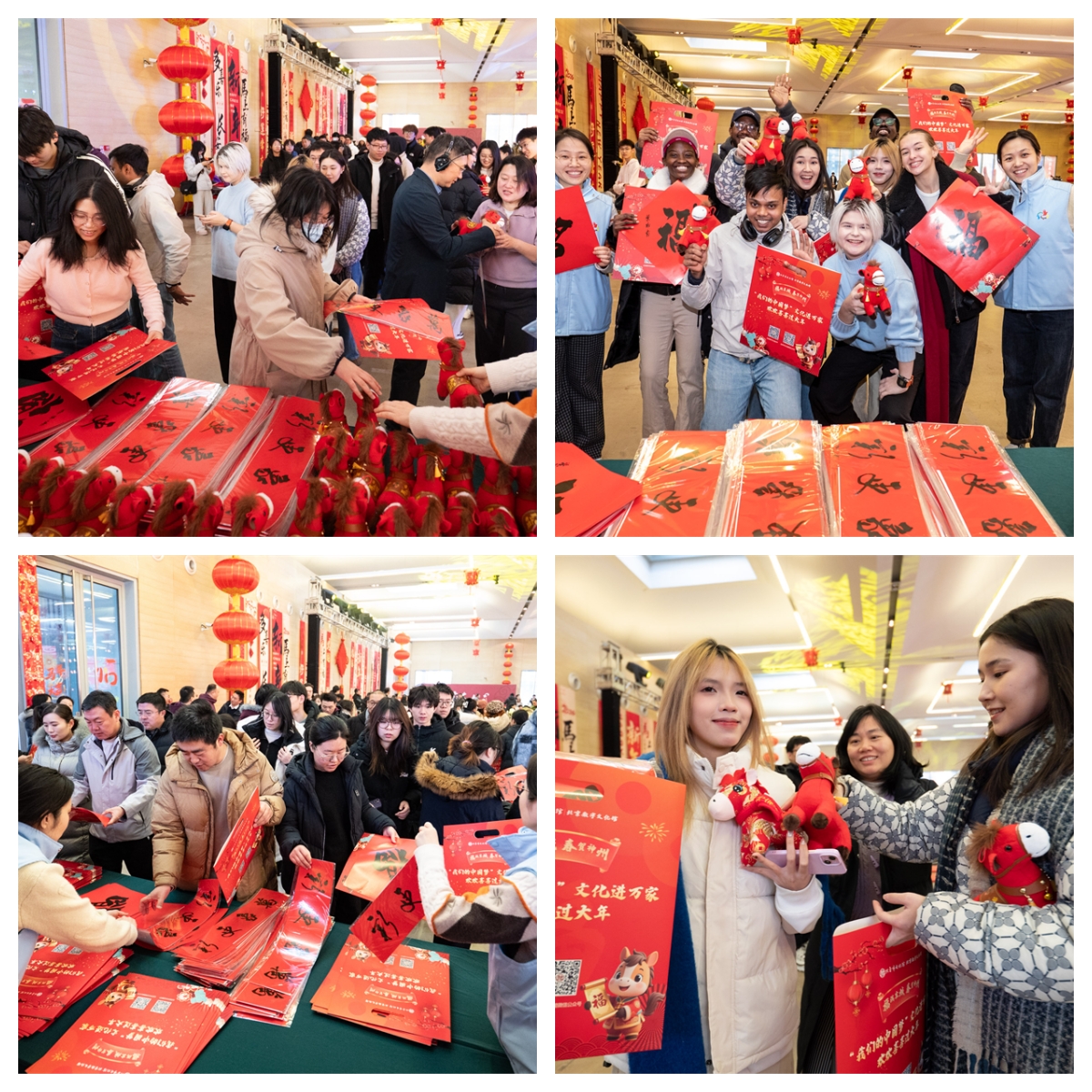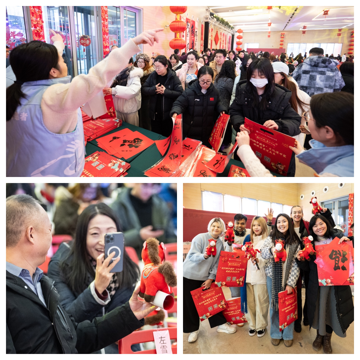 活动场地张灯结彩,红灯笼高悬、中国结摇曳,红彤彤的福字、福气多多的新春福袋整齐铺陈,马年玩偶等吉祥物一应俱全。不少师生闻讯而来,有的驻足欣赏春联内容,有的仔细挑选心仪的马年玩偶。此次活动专门邀请了北京建筑大学的外国留学生参与其中。为更好地让留学生感受到中国传统文化的丰富内涵,文化志愿者化身“文化向导”,耐心向留学生们讲解春联的起源、福字的寓意以及“倒贴福”的民俗典故,留学生们听后纷纷表示:“以前只是在书本和电视上了解过春节,今天能够参与其中,听到更加详细地讲解,才真正感受到春节文化的博大精深,每一个习俗都充满了智慧和温暖。我们要把福字贴在宿舍门上,把中国的好运带给远在他方的家人。”活动现场喜庆祥和,大家在欢声笑语中定格属于中国校园的新春记忆。