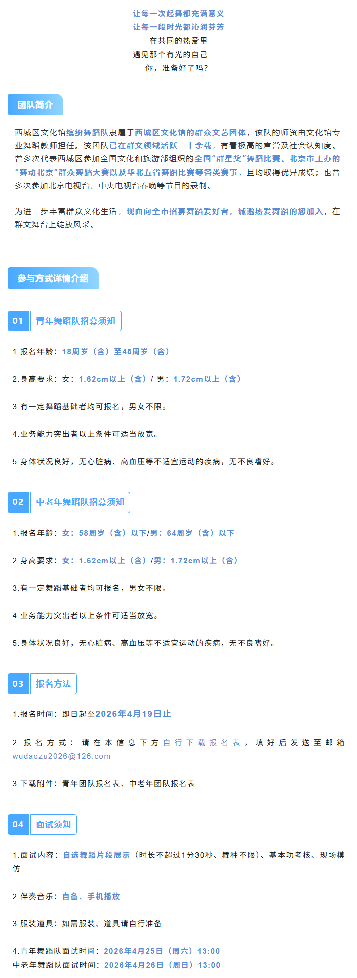 火热招生 | 西城区文化馆2026年缤纷舞蹈队(青年团队、中老年团队) 春暖花开 等你来“嗨”