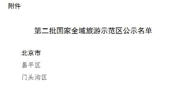 11月18日,文化和旅游部公告公示了第二批国家全域旅游示范区名单,全国各地共99个区域入选。其中,北京有2个区域入选:昌平区、门头沟区。